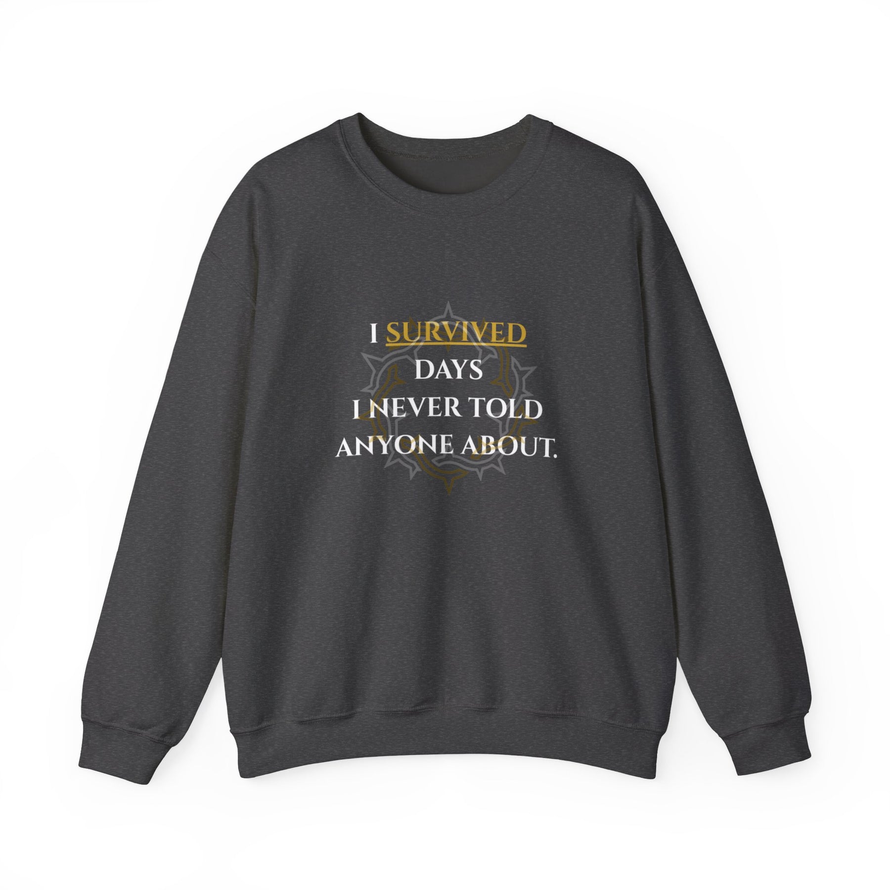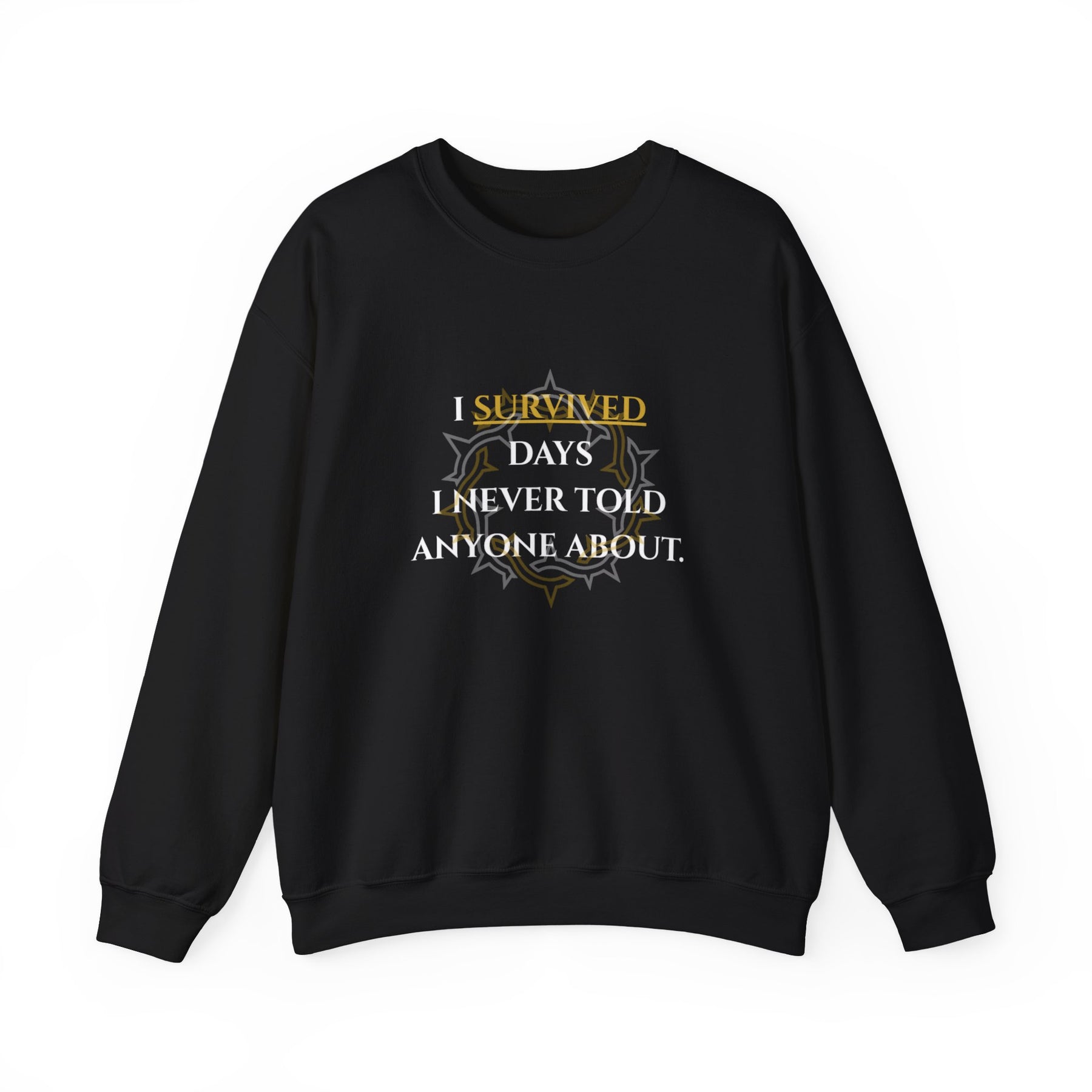 This crewneck sweatshirt carries a quiet, resilient voice — a soft black canvas bearing the line “I survived days I never told anyone about.” Subtle sunburst and thorn motifs frame the text in muted gold and gray, giving the design a weathered, intimate feel. Wear it on slow mornings, long drives, or evenings when you want a comforting layer that says more than words. The medium-heavy cotton-poly blend and classic crew cut make it warm without weighing you down. The understated graphic sits at chest level so it reads like a private badge of endurance, not a shout — for times when comfort and candor are what matter most.